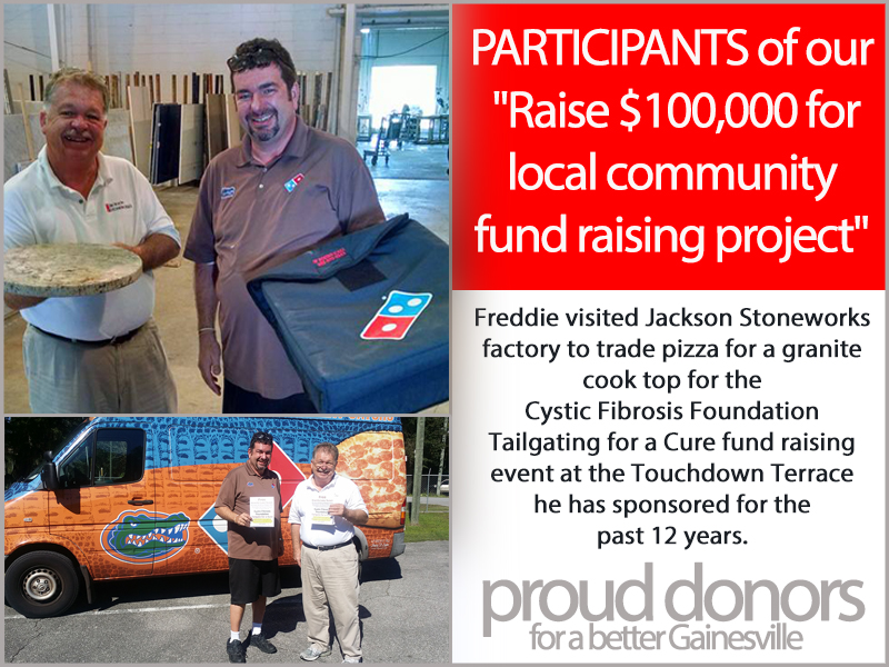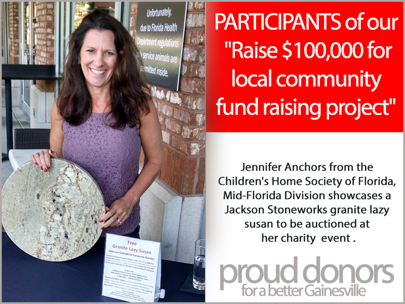 Jackson Stoneworks Granite Buyers Club has pledged to donate 1000 Free Granite Lazy Susans per year for ten years to assist members to raise $1,000,000.00 for local Gainesville, Florida charities and community projects.